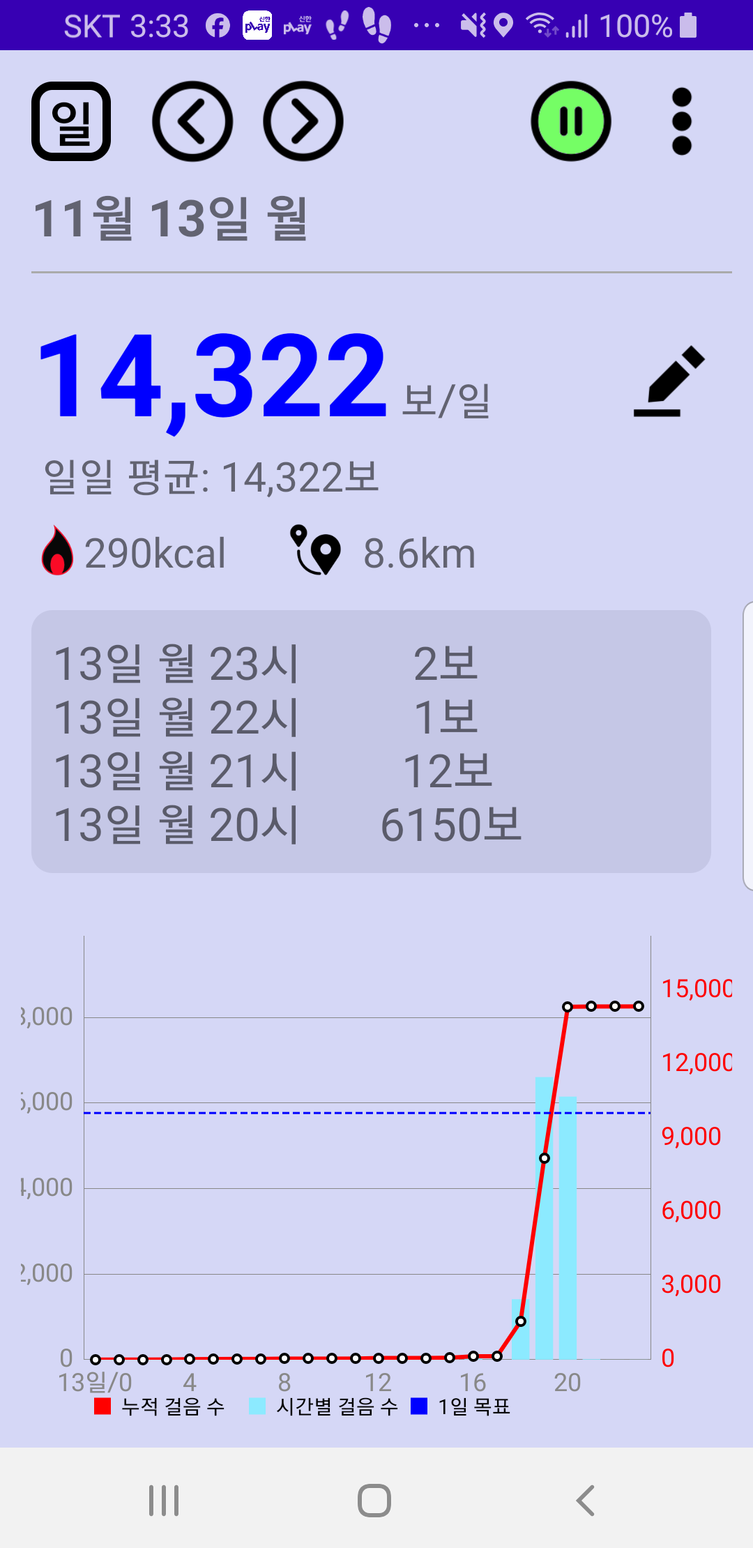 - 건강.만보기> 1일 걸음 목표 설정. 칼로리/이동 거리 산출. 일/주/월 단위 검색. 그래프로 보기. 데이터 백업
