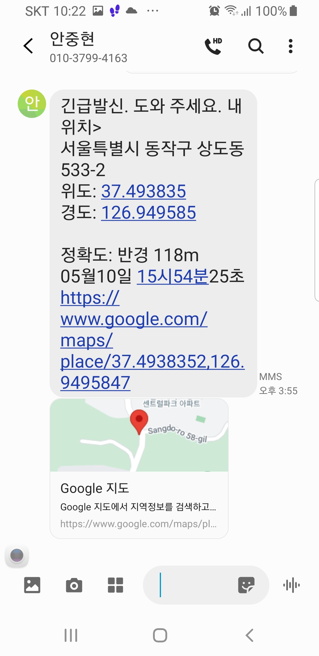 119/112/혹은 지인 문자 메시지 버튼을 누르면 아래와 같은 도움 요청 문자 메시지를 자동으로 전송한다.
