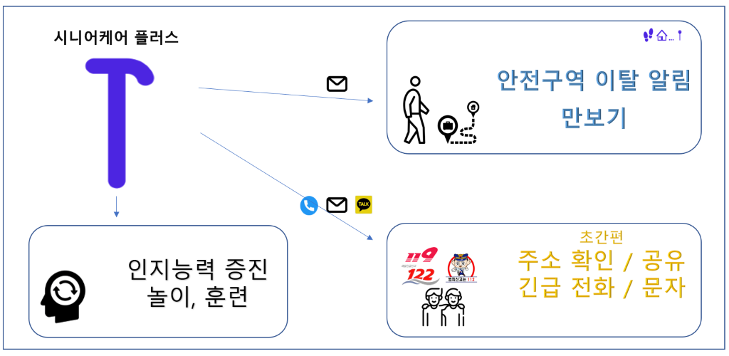 - 안전.위치> 외출, 머뭄, 집 도착 등 다양한 조건에서 보호자에게 문자 메시지로 알림