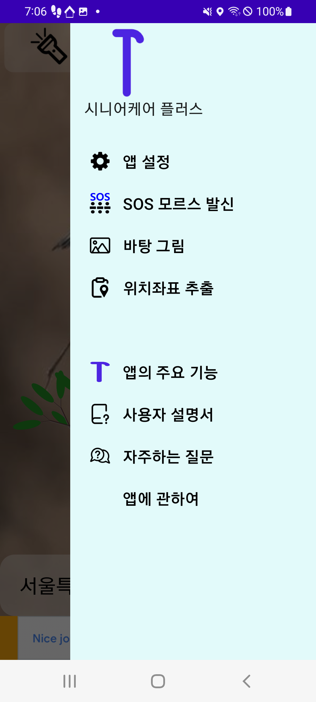 SOS 모르스 발신 켜기 / 끄기> [사이드바 메뉴][SOS 모르스 발신] 누르면 켜지고 다시 누르면 꺼진다. 켜졌을때는 아이콘 녹색 외곽선이 나타나며 점멸한다. 끌때는 화면 상단 [손전등 아이콘]을 눌러도 꺼진다.