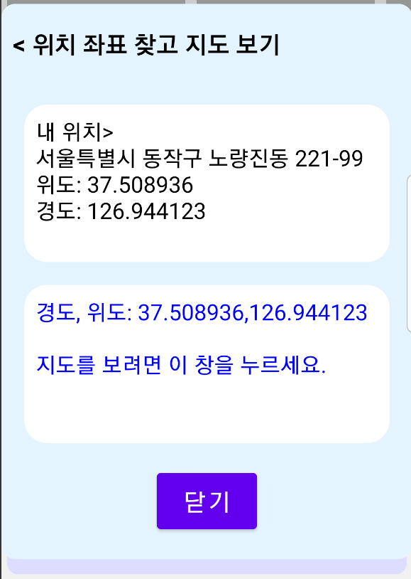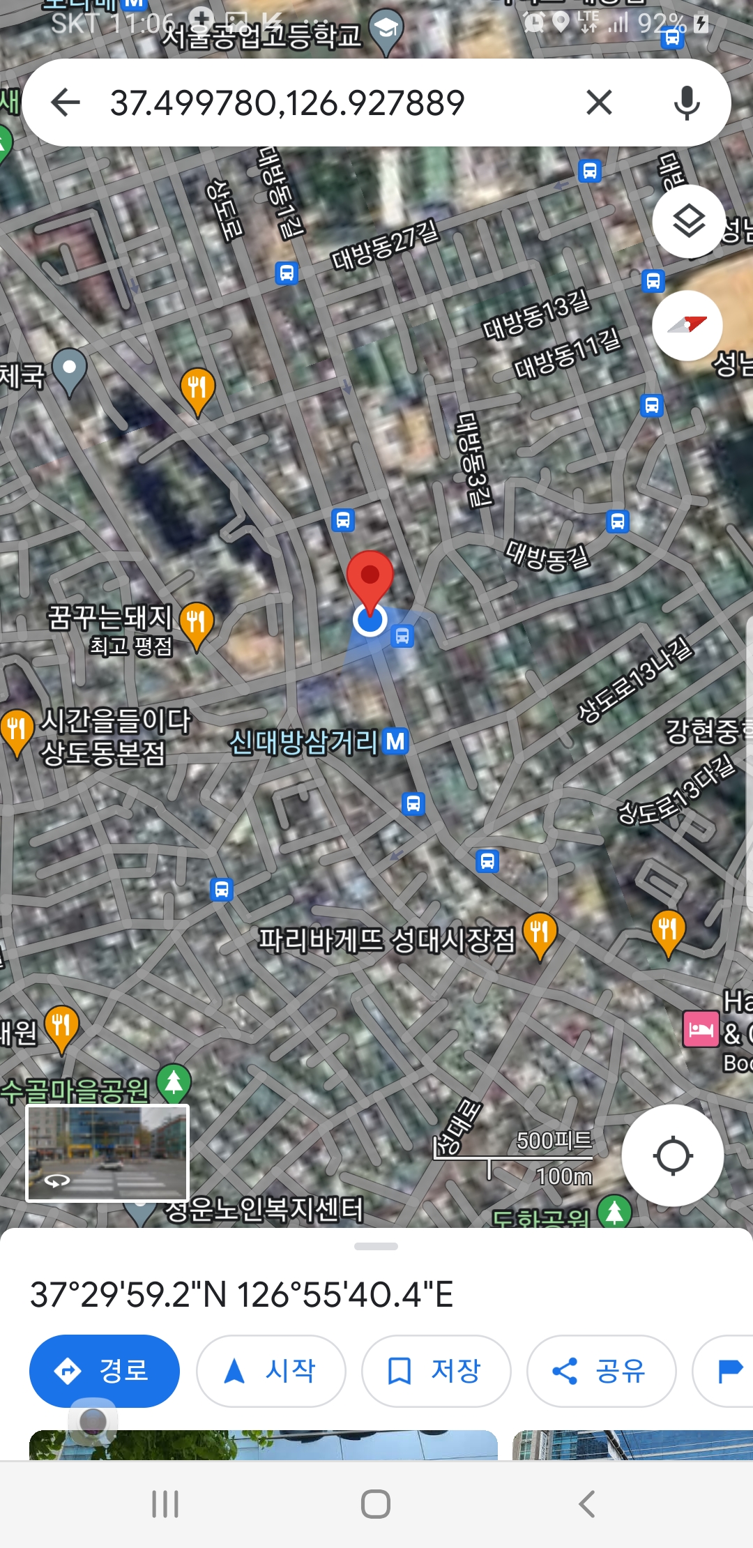 4. 만약 유효한 좌표가 있다면 그 아래 창에 좌표값이 표시된다. 그 창을 누르면 구글 지도가 열리고 그 좌표 위치가 표시된다.