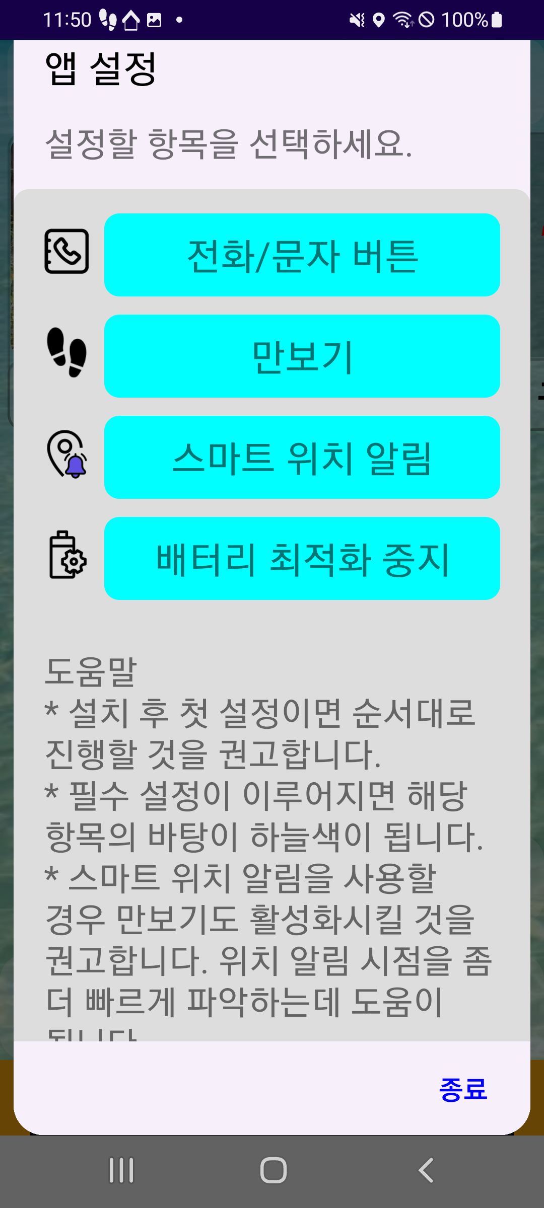 '앱 설정' 화면에서는 '위치 권한', '전화/문자 버튼', '만보기', '스마트 위치 알림' 그리고 '배터리 최적화 중지'을 설정할 수 있다. 앱 설정을 처음할때는 위에서 부터 순서대로 하는 것이 좋다.