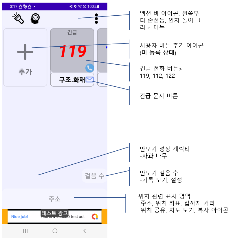 - 요청 접수됨: 계속하여 3회 이상 더 누르면 긴급구조요청이 접수 되었음을 진동을 1초간 울려 알린다. 그리고 긴급 구조 요청 문자를 발송한다.