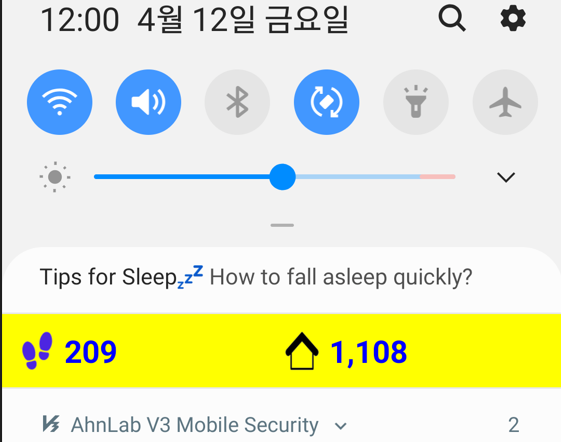 전원 버튼을 살짝 누르거나 화면을 터치하면 잠금 모드에서 알림 트레이를 보여준다 (휴대기기 앱 설정에서, 잠금 모드에서 알림 보이기를 허용한 경우). 위/아래 스크롤 하여 노랑색 바탕의 시니어케어 플러스 만보기 아이콘을 찾는다. 여기에 현재 걸음 수와 집까지의 거리가 표시된다.