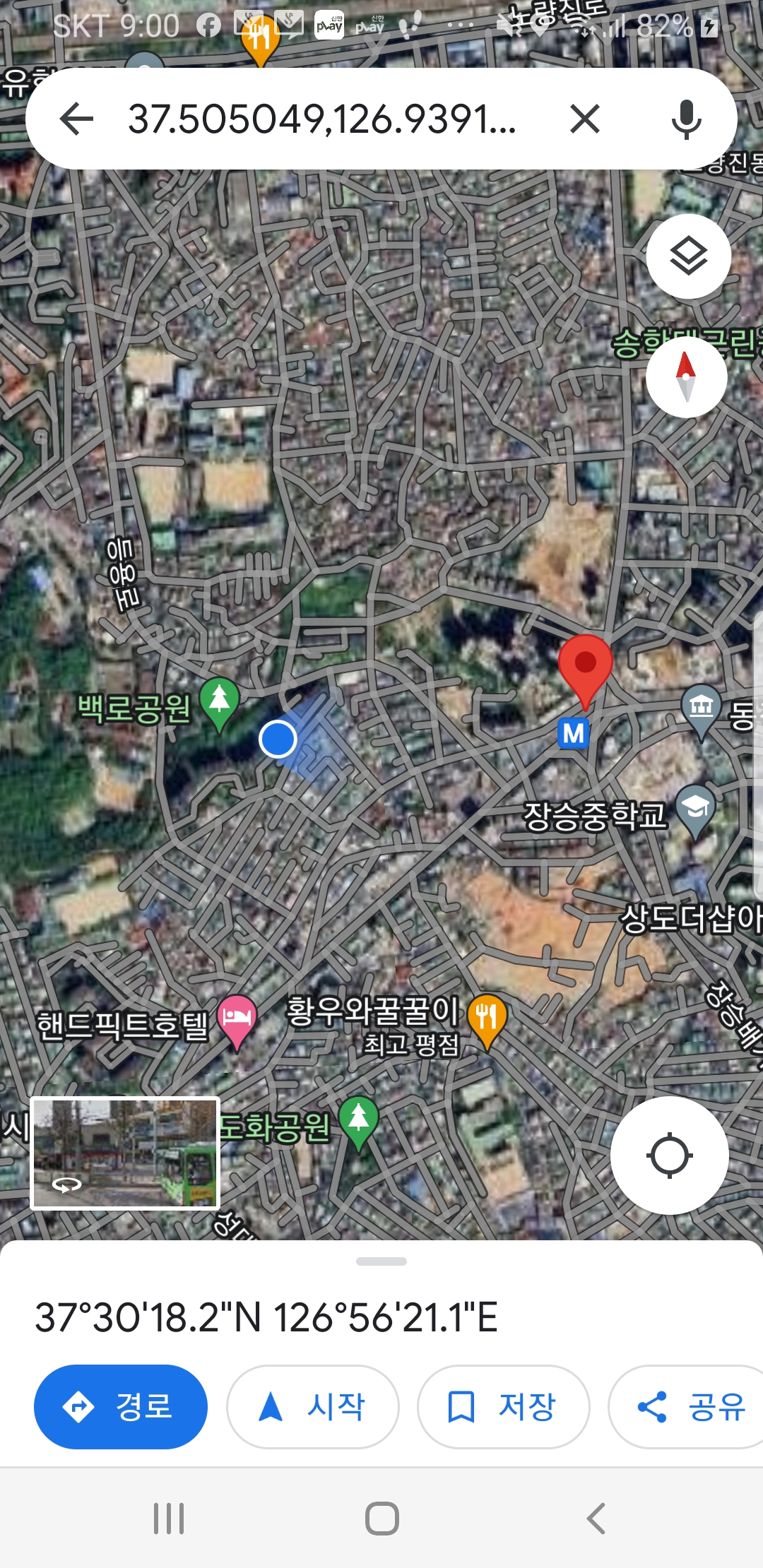 2. 구글 맵이 열리고 직전의 위치에 마커와 (보통 빨강색) 현재 현재 위치가 (보통 파랑색) 표시된다.