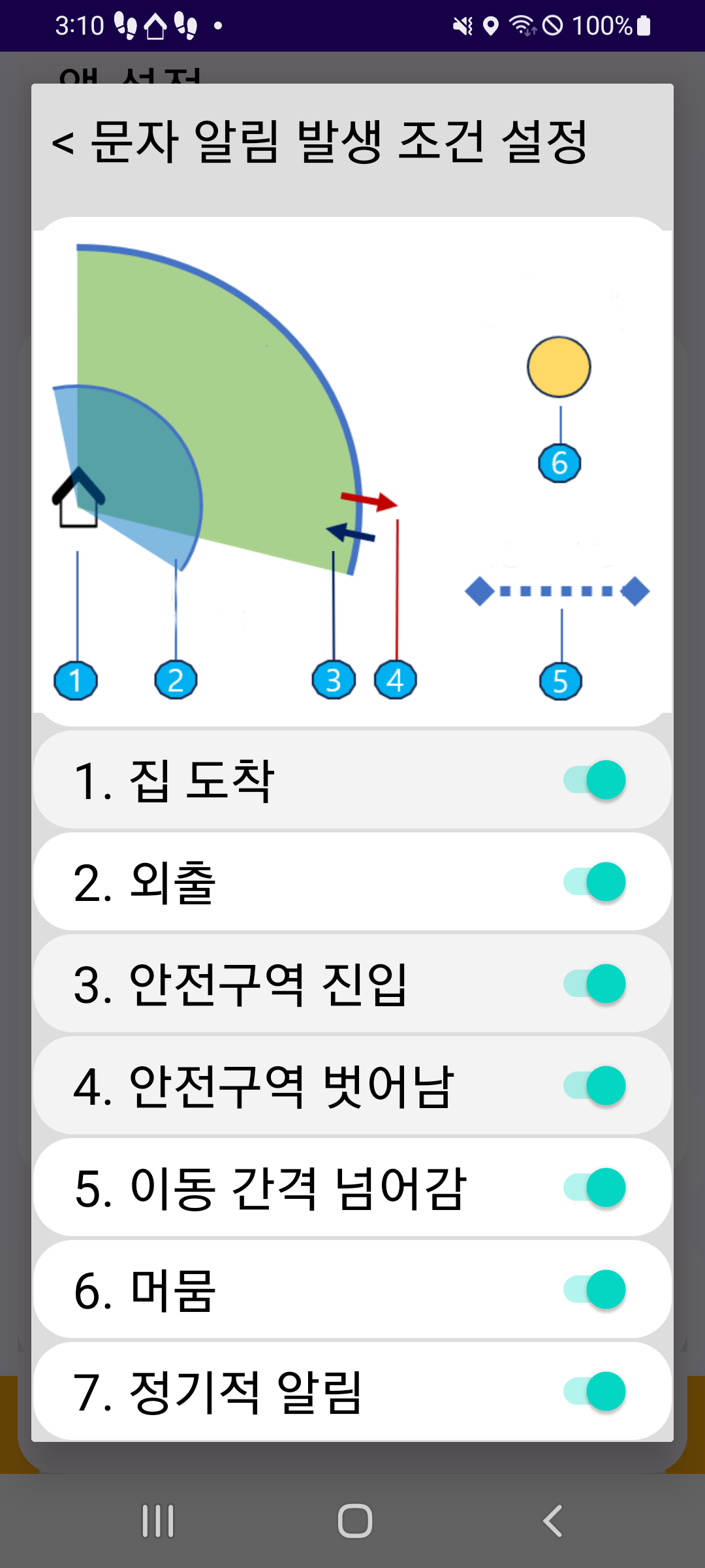 5. 이동 간격 넘어감: 안전구역 밖에서 이동 시 일정 거리 이상 이동하면 알림을 보낸다. 사용자가 이동 간격 범위를 설정할 수 있다.