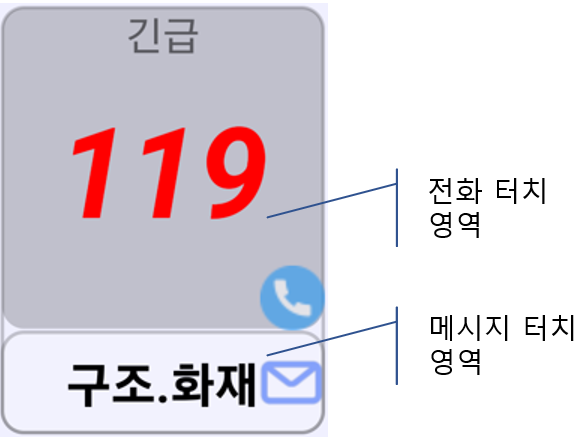 사용자 버튼 하단의 문자 메시지 버튼은 짧게 누르면 일반 메시지 보기 상태이다. 길게 누르면 긴급 문자 보내기 상태가 되고 자동으로 긴급 발신 문자가 올라온다.