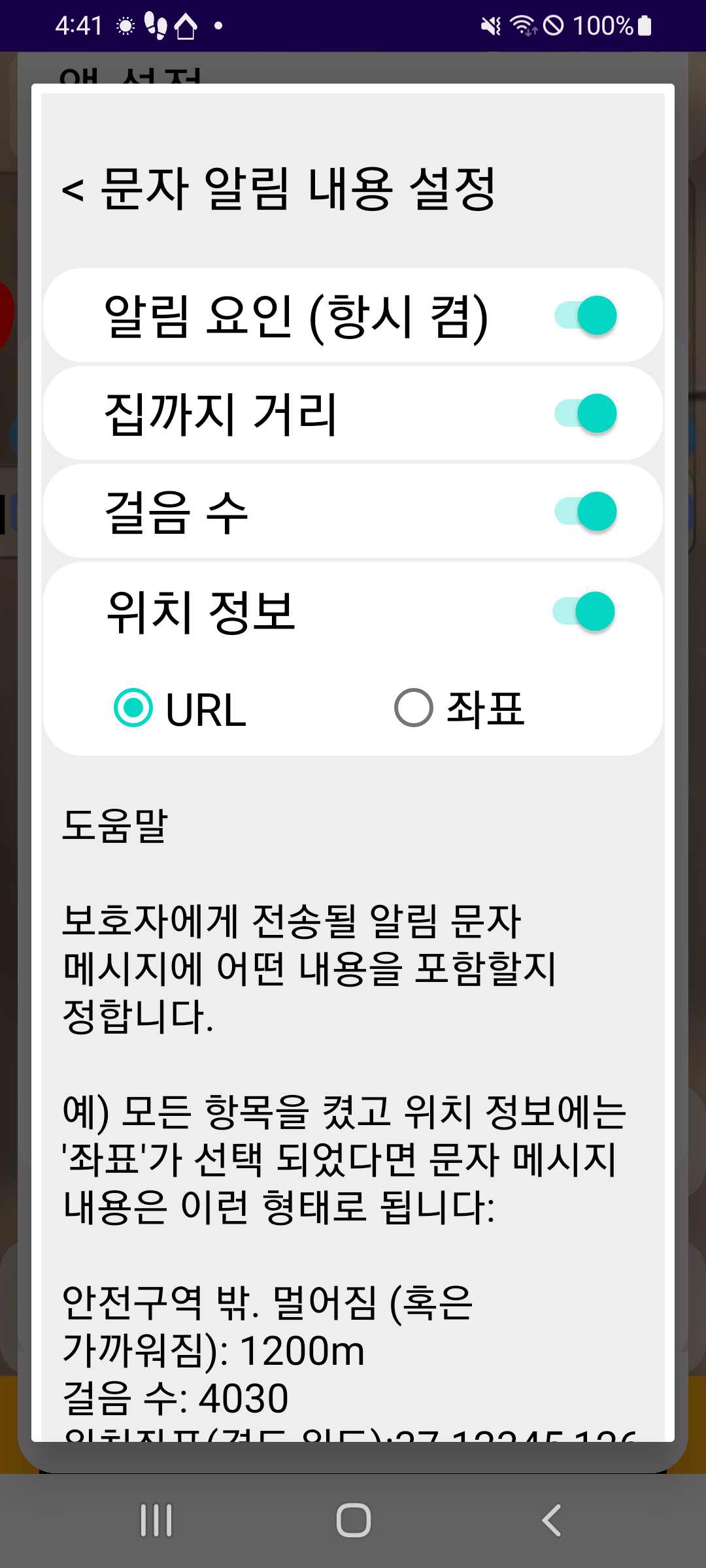 문자 알림 내용에 포함할 항목을 설정한다. 만약 위치 정보를 URL 로 전송되는 것을 꺼리신다면 URL 대신에 위치 좌표만 (위도, 경도) 전송하도록 설정 할 수 있다. 수신자 (보호자) 는 이 좌표를 구글 지도에 표시할 수 있다. 방법은 아래 참조.