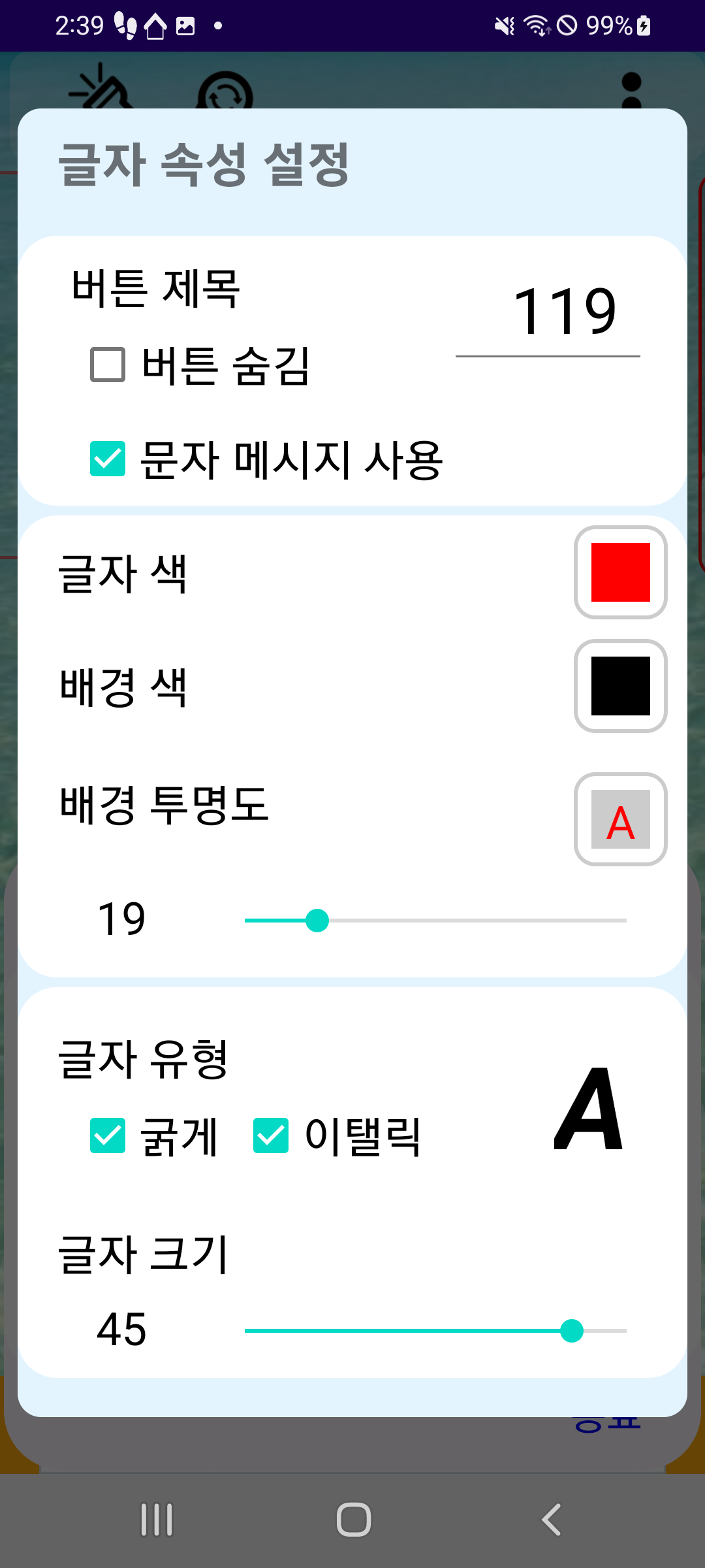 - 버튼 제목 글자의 크기, 색, 배경 색, 배경 투명도 및 글자 유형을 설정할 수 있다