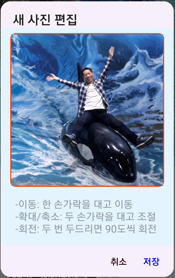 손가락을 이용하여 사진을 이동 (손가락 한개), 확대/축소 (두 손가락으로 핀치 줌), 회전 (두번 두드리면 90도씩 회전) 시키면서 편집하고 끝나면 저장한다.