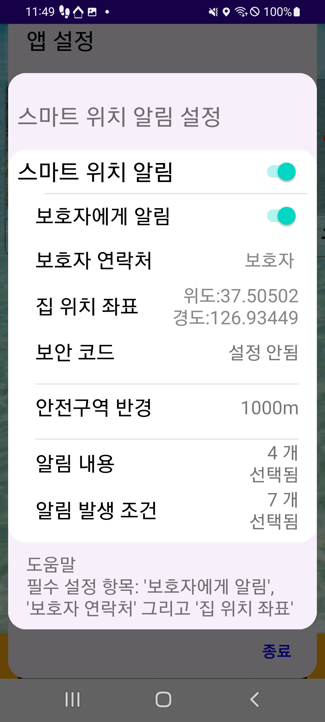 6. 머뭄: 한 장소에서 (약 100m 이내) 30분 이상 머물면 알림을 보낸다. 사용자가 머뭄 시간 간격을 설정할 수 있다.