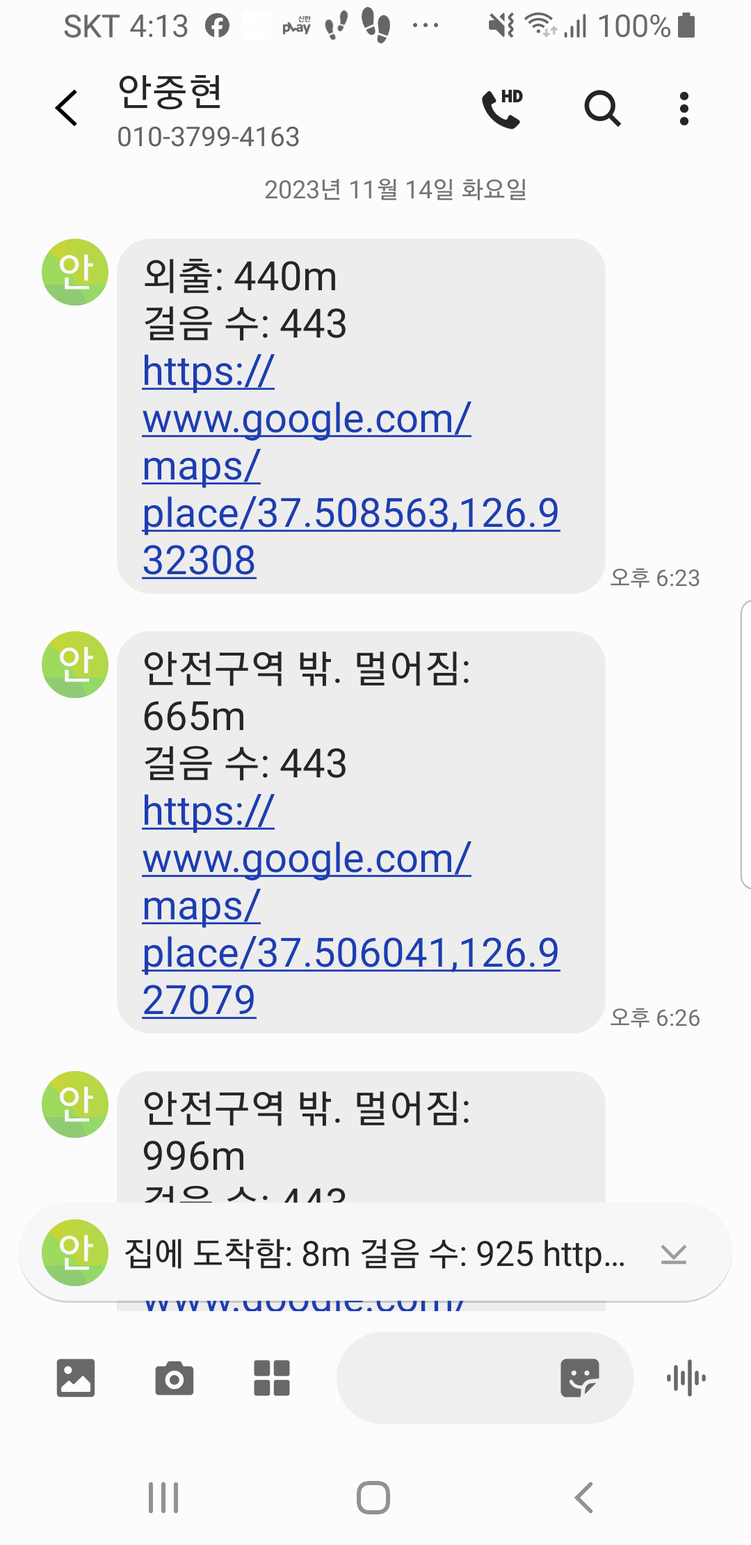 스마트 위치 알림에서 발송된 문자 알림에 포함된 위치 정보와 구글 지도 보기 기능을 이용하여 과거에 알림이 발생한 곳의 방향을 알 수 있다. 예를 들어 직전에 알림이 발생한 곳으로 복귀하는 예를 설명하자면,