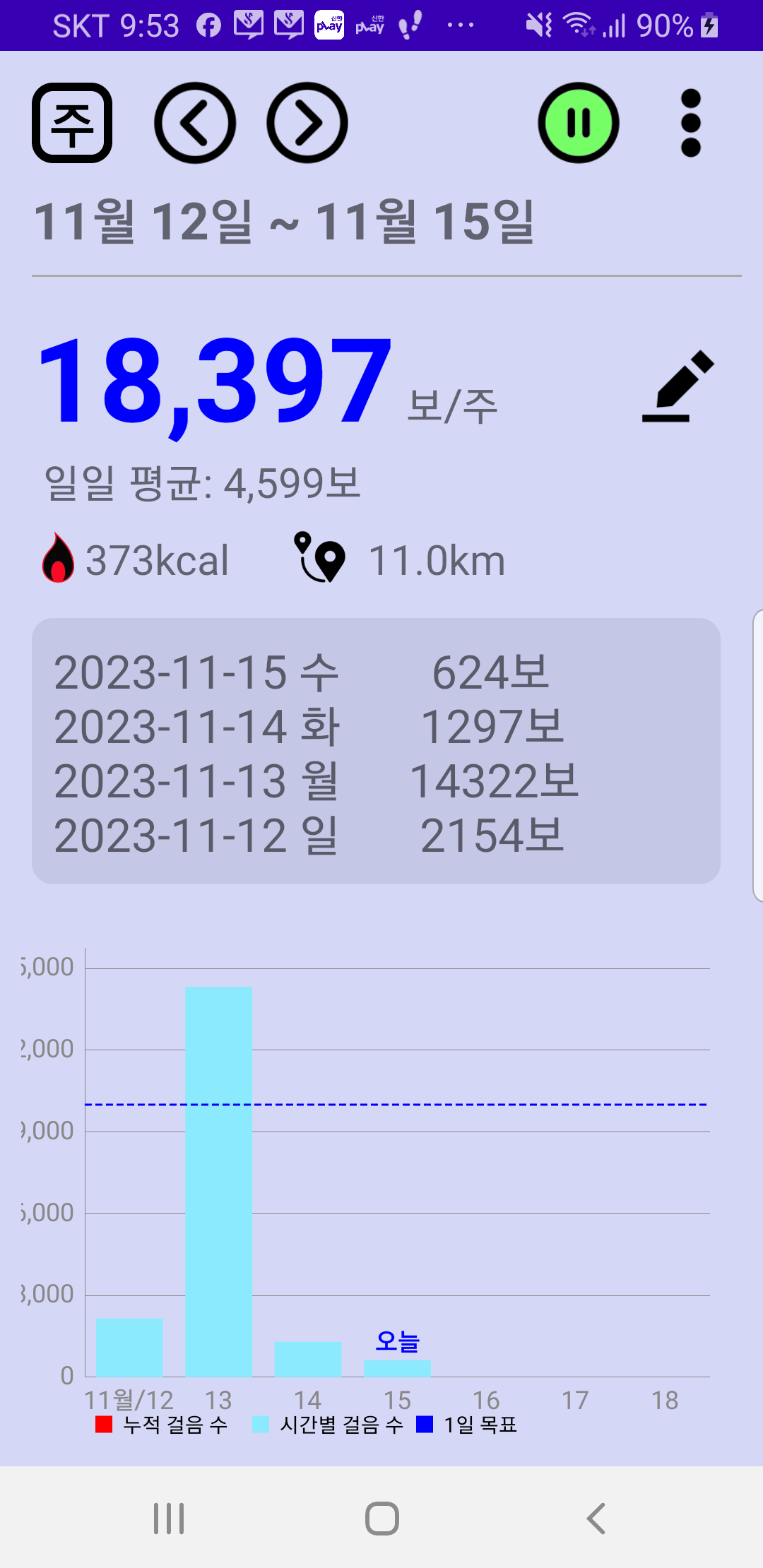 일일 걸음 목표 설정: 목표 값이 설정되면 하루 목표 달성 비율 계산 때 사용합니다. 그리고 기록 보기에서 목표를 파랑색 가로선 그래프로 보여줍니다