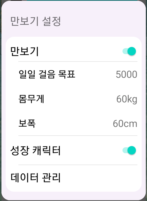 [만보기 설정] 에서 성장 캐릭터를 활성화 한다.